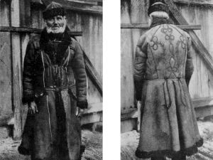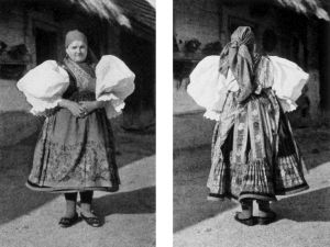 Auf dem Bild: Marie Storch aus Lochutzen in der Tracht der Altbäuerin Sadlo aus Horschikowitz. (Abb. aus: Storch, Heimattracht, in: Der Heimatkreis Mies, 1962, S. 224; Fotograf: Martin Storch);            Abb. 2: Bauer aus der Chotieschauer Gegend im langen Pelz, vor 1932 (aus: Hoffmann, Deutsche Volkstrachten und Volksbräuche, 1932, S. 218; Fotograf unbekannt)