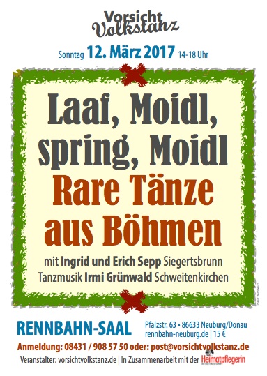 Den Bericht von Roland Opschondek über das von Vorsicht Volkstanz in Zusammenarbeit mit der Heimatpflegerin der Sudetendeutschen organisierte Tanzseminar „Laaf Moidl, spring Moidl“ - Rare Tänze aus Böhmen - der in der Sudetendeutschen Zeitung am 31. März 2017 erschienen ist, finden Sie hier.