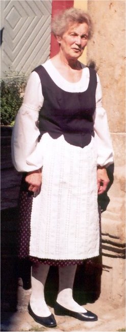 Es handelt sich um eine einfache Tracht, deren einziger Schmuck die handgeklöppelten Spitzen an Bluse und Schürze sind. Die Bluse aus weißem Leinen hat einen runden Halsausschnitt aus Klöppelspitze und lange Ärmel mit Klöppeleinsatz am Oberarm und am Bündchen.